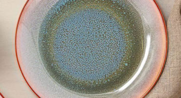 Несмотря на то что отделка посуды из коллекции «Авантюрин» не включает в себя сложную роспись или дорогостоящее покрытие, мастерам пришлось немало потрудиться над ее декорированием. Основным элементом здесь служит глазурь, окрашенная в технике мультиколор. Особая консистенция покрытия позволила дизайнерам создать плавный переход от красновато-бурого к зеленовато-серому тону и придать текстуре наибольшую степень сходства с чарующим авантюрином. Чтобы окрашивание сохранилось на длительный срок, поверхность каждой тарелки они покрыли слоем прозрачной глазури.