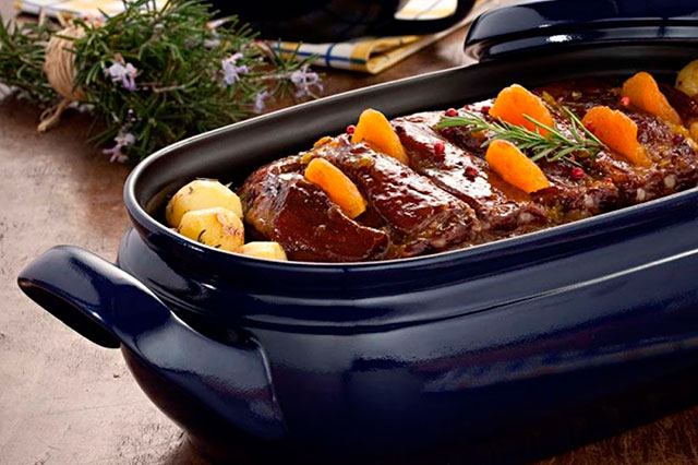 Для запекания целиком крупных кусков мяса или птицы также часто используют глубокие формы с высокими крышками. В них получается добиться наилучшего эффекта: ароматная корочка и сочное, нежное филе, не пересушенное благодаря равномерному распределению тепла внутри.