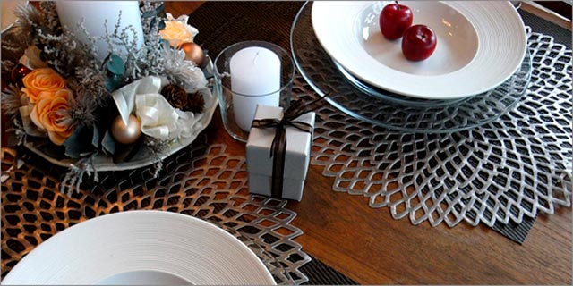 Начните с классики — белое и черное: например, белая скатерть-дорожка на черном столе или в сочетании с черными салфетками (в том числе — подстановочными). Чтобы придать новогодний вид, добавьте серебристого, красного и/или зеленого: например, цветной текстиль и посуда, серебристый декор (свечи, подсвечники, елочные игрушки, статуэтки) и приборы.