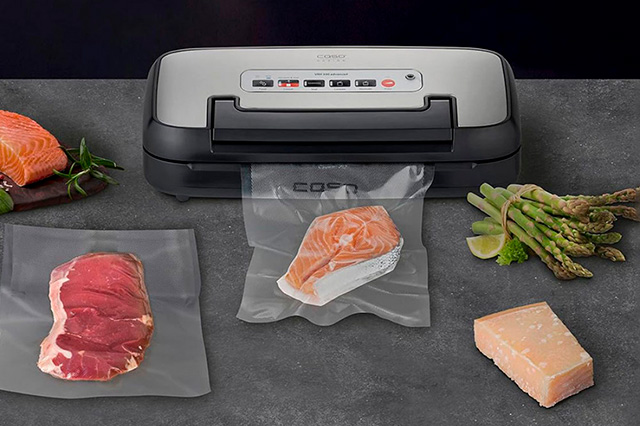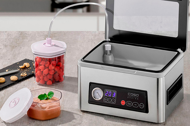 2. Настольные камерные вакууматоры – большие и более мощные устройства, которые уже можно использовать и на профессиональных кухнях или при производстве пищевых продуктов. Они могут упаковывать большие объемы пищи и имеют более широкий функционал, чем ручные вакууматоры. Но такие вакууматоры не подходят для напитков, но подходят для супов. Благодаря тому, что воздух удаляется из всей камеры, жидкость не выливается из-за разницы в давлении. Такие модели есть у CASO.