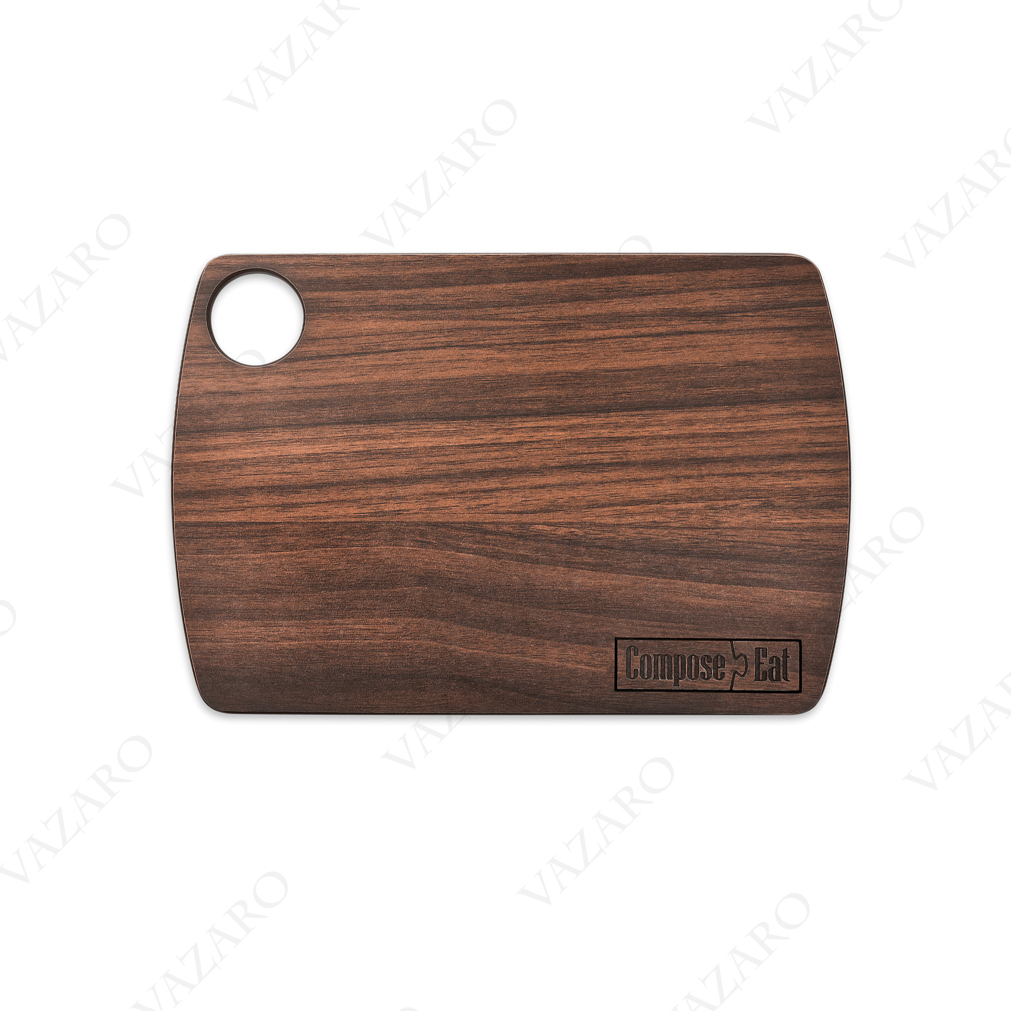 Само название бренда Compose Eat говорит о ключевом направлении деятельности компании. Ею был разработан уникальный композитный материал, в основе которого лежат слои крафтовой и декоративной бумаги, пропитанные экологически чистыми термопластичными смолами. В результате интенсивного влияния пресса материал приобретает невероятную степень плотности и прочности. Из цельных листов вырезаются заготовки досок, которые шлифуются, обрабатываются и тестируются на качество. Канавки по линии каемки, а также символика бренда вырезается лазером.