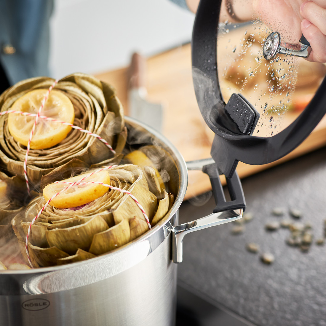 В ряду прочих изделия этой коллекции, безусловно, выделяются оснащением крышек и рукоятей. Резиновые ободки, изготовленные их жаропрочного полимерного материала, обладают высокими термозащитными функциями и не подвергаются деформации даже при взаимодействии с субстанциями, температура которых превышает 100°C. Гибкая основа ободка крышки позволяет пару максимально эффективно испаряться, а получающиеся в результате его конденсации капли стекают не по внешней, а по внутренней поверхности чаши. Кроме того, каемка крышки может фиксироваться за ободок ручки и образовывать устойчивую конструкцию — вам больше не нужно искать места, для того чтобы положить снятую крышку. Эта же конструкция позволяет удалить лишнюю жидкость из кастрюли.