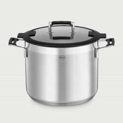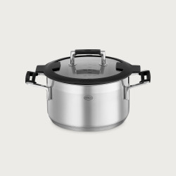 В ряду прочих изделия этой коллекции, безусловно, выделяются оснащением крышек и рукоятей. Резиновые ободки, изготовленные их жаропрочного полимерного материала, обладают высокими термозащитными функциями и не подвергаются деформации даже при взаимодействии с субстанциями, температура которых превышает 100°C. Гибкая основа ободка крышки позволяет пару максимально эффективно испаряться, а получающиеся в результате его конденсации капли стекают не по внешней, а по внутренней поверхности чаши. Кроме того, каемка крышки может фиксироваться за ободок ручки и образовывать устойчивую конструкцию — вам больше не нужно искать места, для того чтобы положить снятую крышку. Эта же конструкция позволяет удалить лишнюю жидкость из кастрюли.