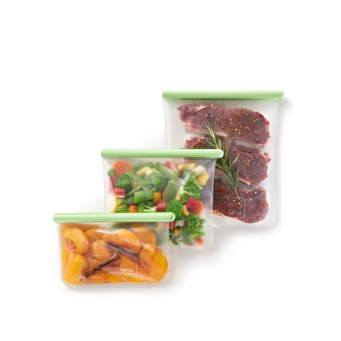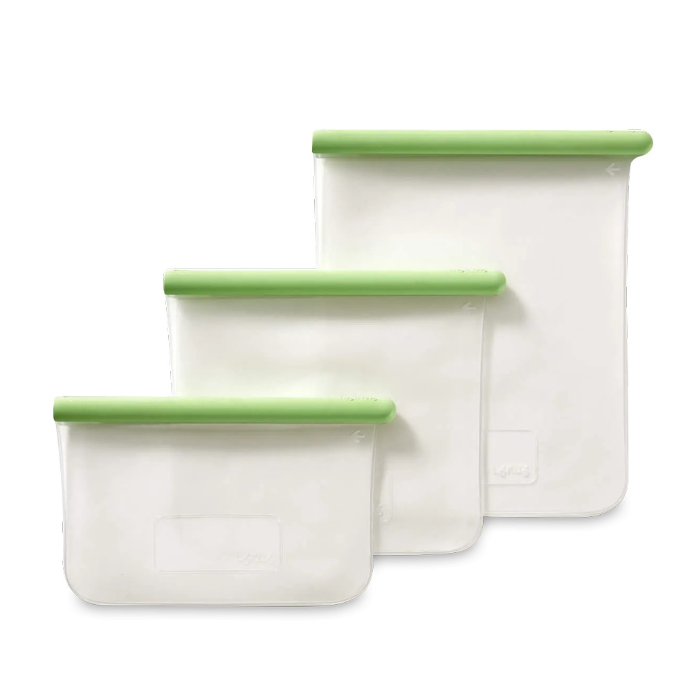 Набор из 3-х плоских пакетов для хранения продуктов, 500 мл + 1 л + 1.5 л, силикон, зеленый, серия Reuse & Reduce, LE883446, LEKUE, Испания