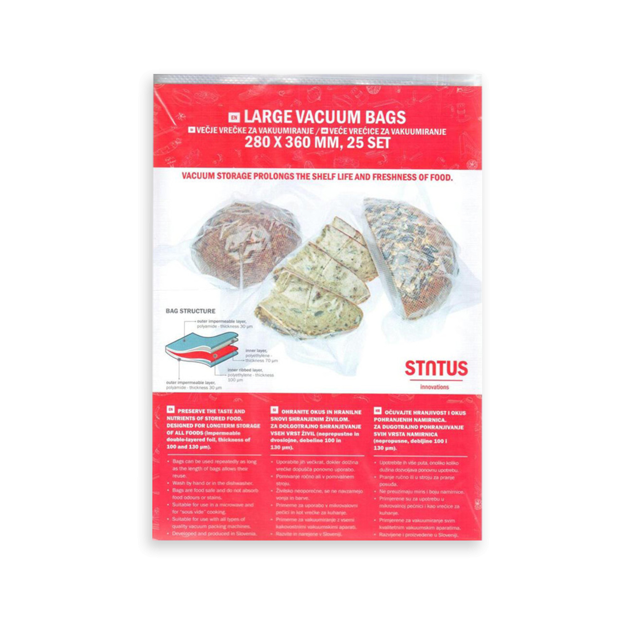 Все пакеты и наборы для вакуумной упаковки от Status можно использовать многократно, замораживать в морозильной камере и мыть в посудомоечной машине.