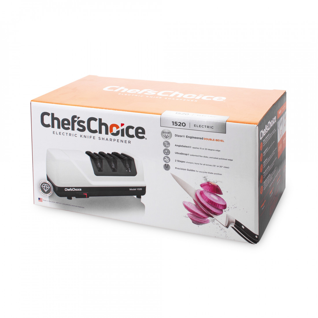 Chef’sChoice® Model 1520 быстро и легко заточит практически все качественные кухонные ножи, хозяйственно-бытовые режущие инструменты американского, европейского или азиатского типа, с ровной режущей кромкой и серрейтором, ножи типа Santoku и традиционные японские модели с односторонней заточкой, включая и очень толстые в обухе ножи типа Deba, спортивные и складные карманные ножи.Электроточилка Model 1520 придаст вашим ножам настоящую бритвенную остроту, ваши ножи будут заточены лучше, чем изначально на заводе-изготовителе! Все это вы сможете сделать с помощью только одной универсальной точилки 1520!